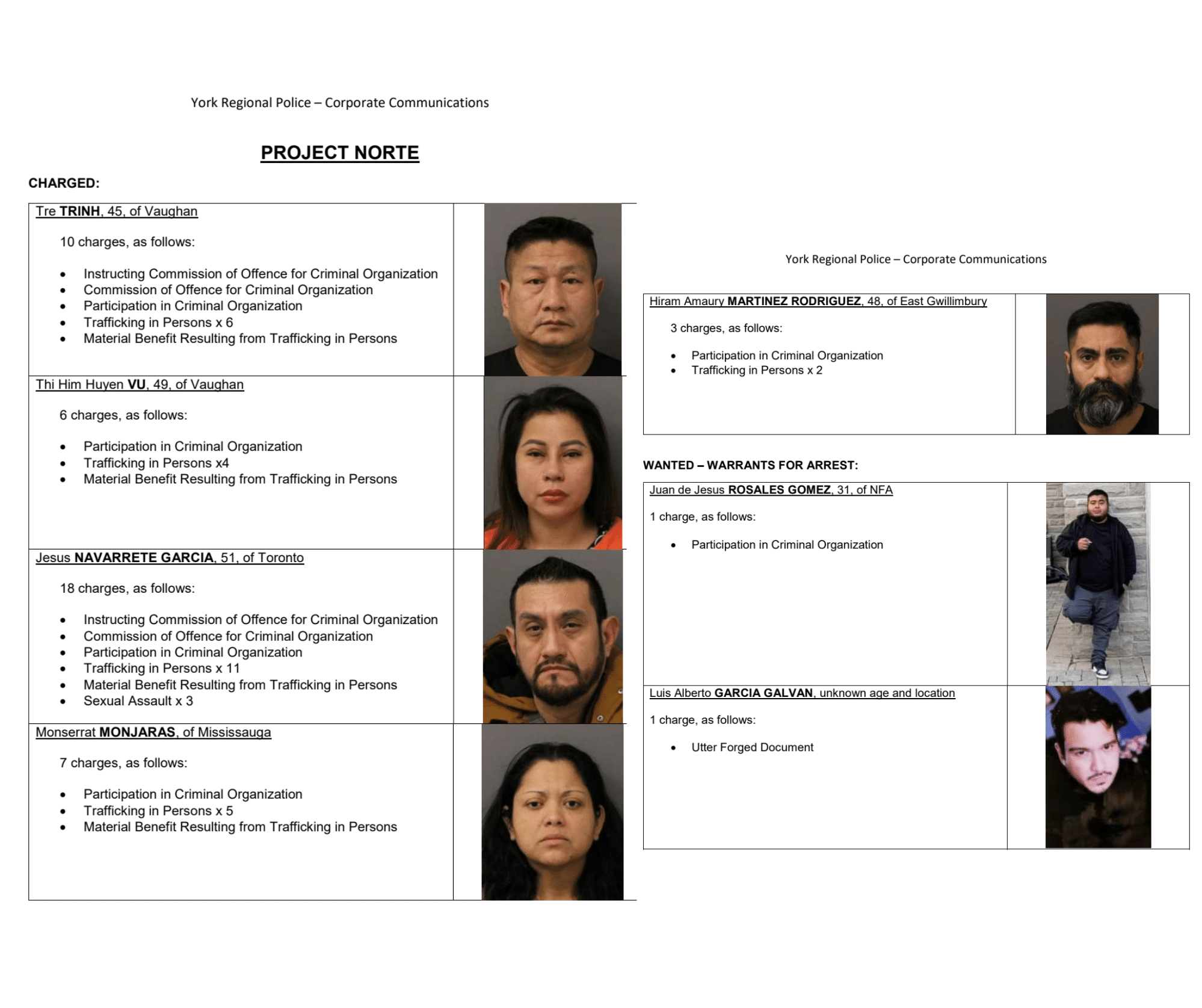 Agregaron que el 8 de febrero de 2023, luego de una investigación exhaustiva, oficiales de la Policía Regional de York, junto con miembros de la OPP, el Servicio de Policía de Toronto y la Policía Regional de Peel, ejecutaron órdenes de allanamiento en cinco propiedades en el Pueblo de East Gwillimbury y las Ciudades de Vaughan, Toronto y Mississauga. Como resultado, 64 trabajadores explotados fueron rescatados, cinco personas fueron detenidas y procesadas y dos sospechosos destacados tenían órdenes de arresto.